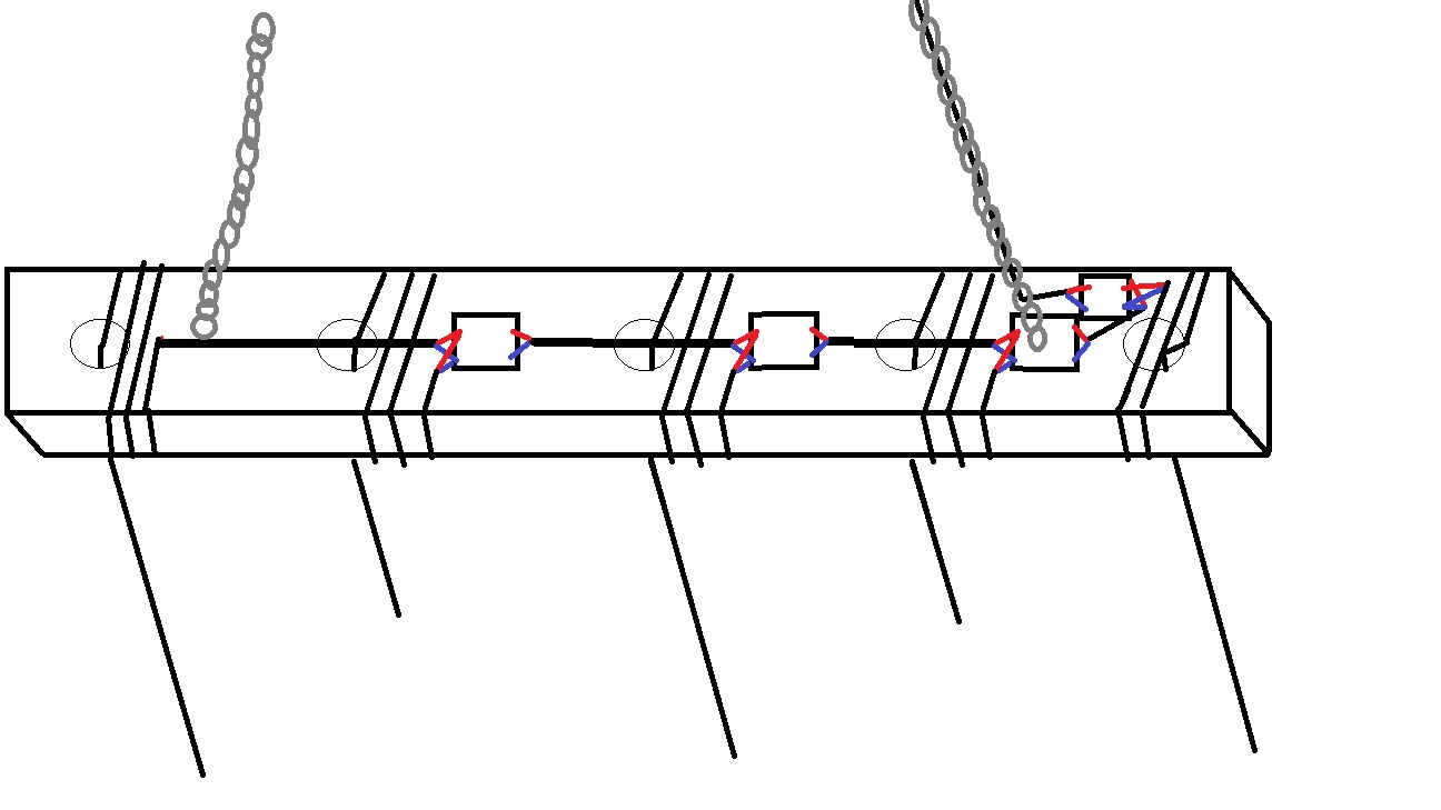 - Bevestig tussen elk gat en aan het uiteinde (rechts) een kroonsteentje De kroonsteentjes dienen aan de bovenkant van de balk te zitten, zodat je ze straks niet ziet.
